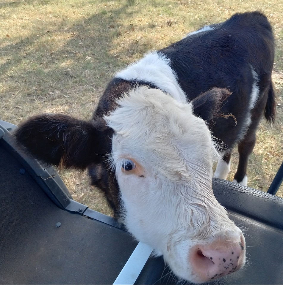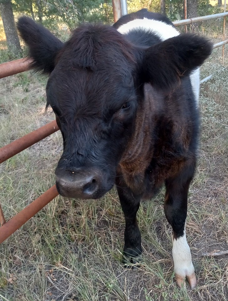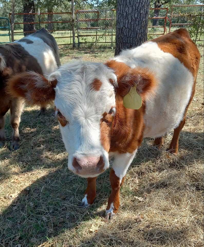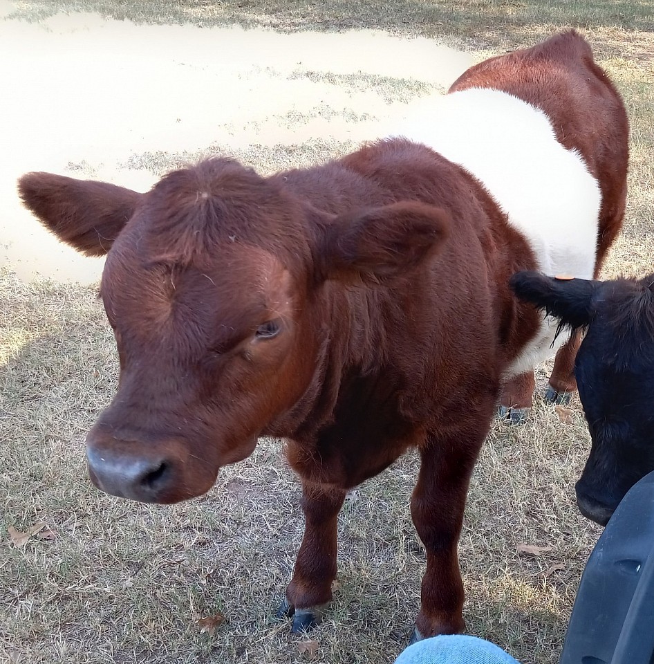 This little love bug was born June 27, 2025. She is the most approachable and "pettable" calf I've ever had. Out of Jojo (mini Hereford) by Abraham (mini-belted). She will be weaned and ready for deliver around Christmas 2025.